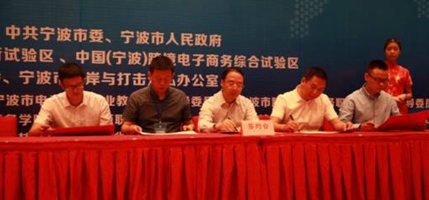 随后,宁波市教育局副局长胡赤弟、宁波市电子商务公司经理徐盈群和宁波市跨境电子商务公司常务副经理周志丹代表宁波国家职业教育与产业协同创新试验区、宁波市电子商务公司、宁波市跨境电子商务公司与全国14家知名跨境电商产业园区、第三方平台和知名企业代表签署跨境电子商务产学研合作框架协议。