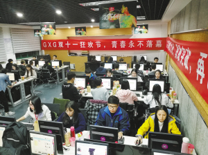 11日早晨8点多,80多名同学们还坚守在电脑前。这几天通宵已成了家常便饭,他们为显钢旗舰店、牛卡旗舰店、福路宝等共5家店铺创下200万元的销售业绩。