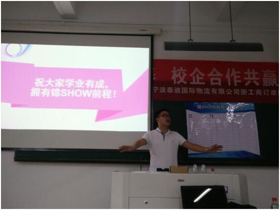 最先由报关与国际货运专业主任滕颖老师致辞,表达了对我们的期望,以及对校企合作的高度肯定,并对未来的合作与企业达成共同意愿。紧接着宁波市泰迪国际物流有限公司的邬旭军总经理进行了自我介绍,凑巧和荣幸的是邬总也是工商的学长,这让我们引以为豪。