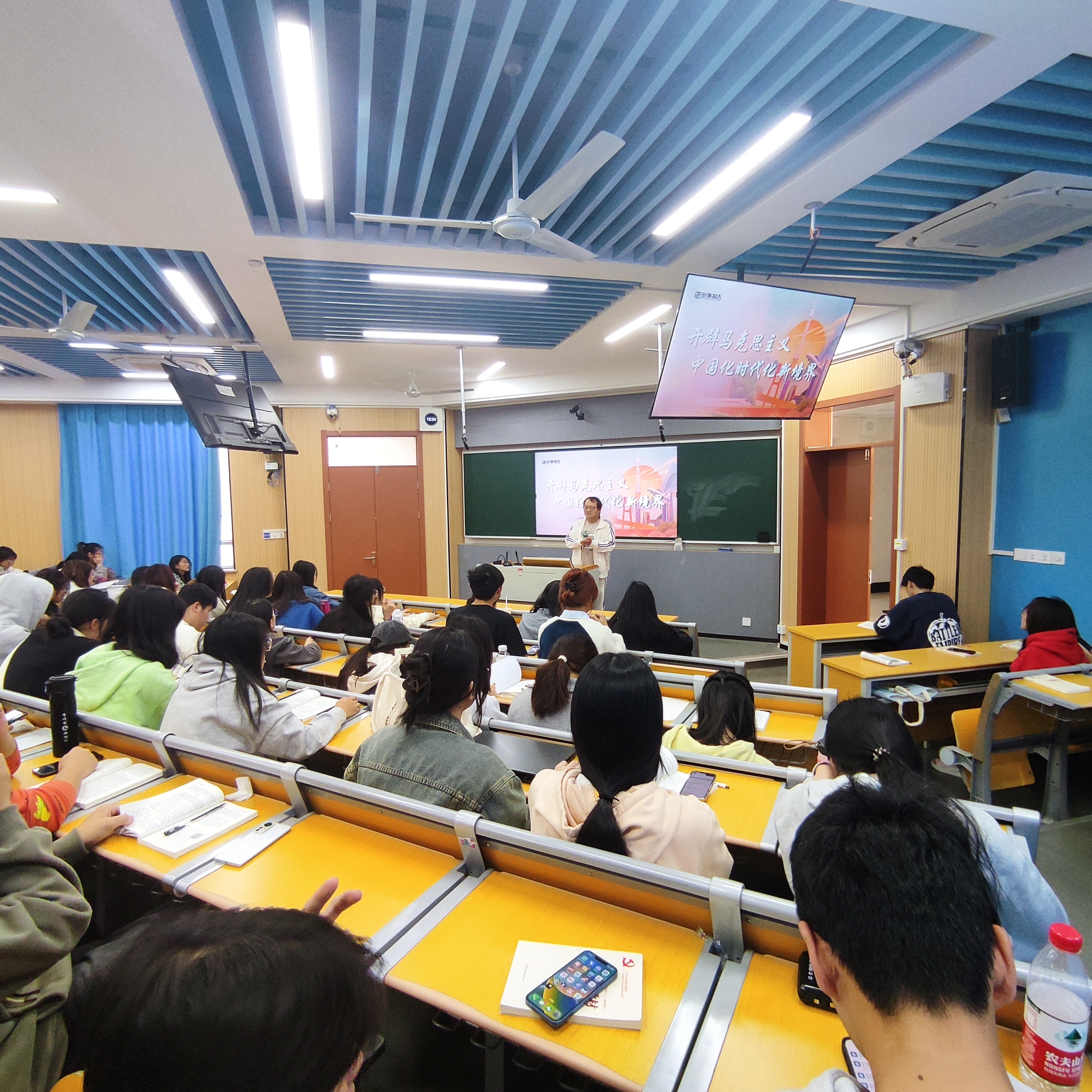 此次授课,王磊老师讲授的内容是“中国特色社会主义思想”。具体为,中国特色社会主义思想创立的时代背景,立足时代之基,回答时代之问,引领时代之变。习近平新时代中国特色社会主义思想富有实践伟力,体现在北斗的建设与华为的创新性发展,重点在于六个坚持,同时同学们观看相关影视视频,深刻理解中国共产党庄严和历史责任。