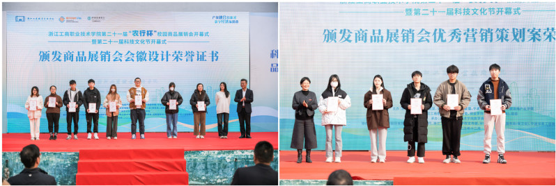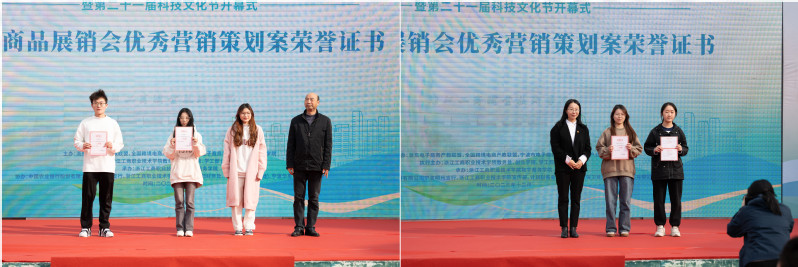 校领导与嘉宾为商品展销会会徽设计、优秀营销策划案获奖员工颁发荣誉证书。