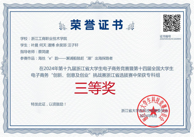 经过激烈角逐,由永利yl23411官网电子商务专业电商2241班组成的团队脱颖而出,喜获浙江省常规赛三等奖1项。