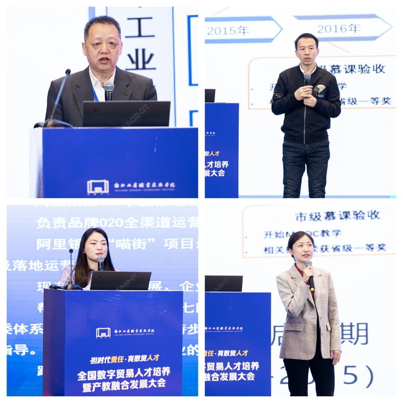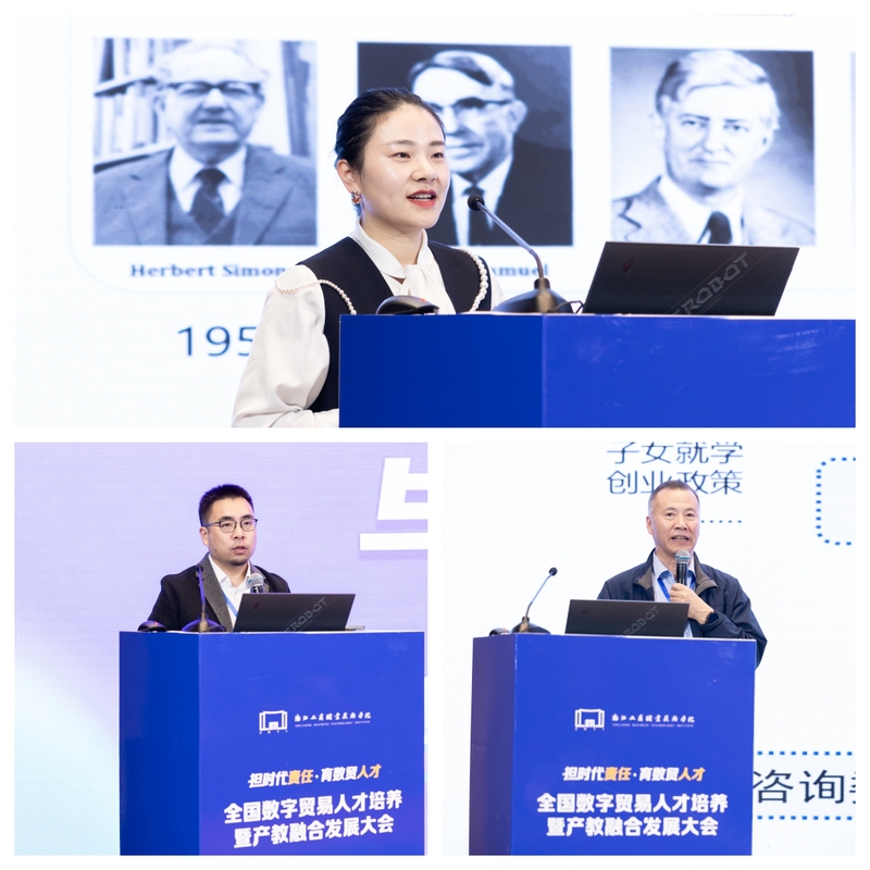 主旨专题报告环节,科大讯飞科讯嘉联市场总监陈超,李川、杨根科、汪虹,以及公司永利yl23411官网学术副经理许辉、浙江三板斧企业管理有限公司总经理何琴、公司跨境电子商务专业副教授周锡飞分别作了《科大讯飞AI助力教育数字化转型及高质量发展》、《阿里巴巴的数字化管理与智能化战略决策》、《上海交通大学宁波人工智能研究院创新案例分享报告》、《宁波汽车零部件行业数字贸易转型升级》、《国家在线精品课程<跨境电商实务>分享》、《tiktok跨境电商的发展趋势》、《国家在线精品课程<国际市场营销>分享》的专题报告。