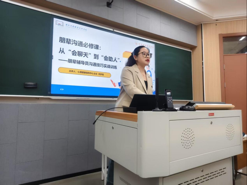 课程伊始,苏老师以朋辈辅导员的角色定位为切入点,强调:我们不是专业心理咨询师,而是同学们身边的倾听者与支持者。她形象地将朋辈辅导员比作心灵桥梁,通过同龄人的视角提供情感支持与经验分享,帮助同学在日常学习生活中及时化解小困扰。
